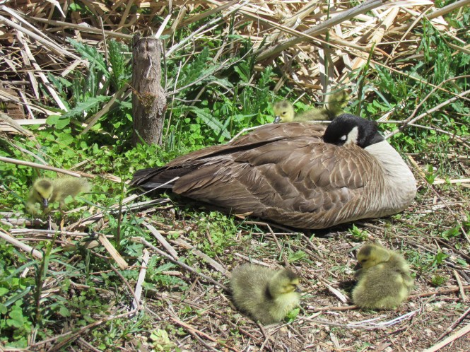 Even though I wasn’t present during the actual hatching of this new generation of Canada Geese, I saw this family of seven when the five goslings were only a day or two old.