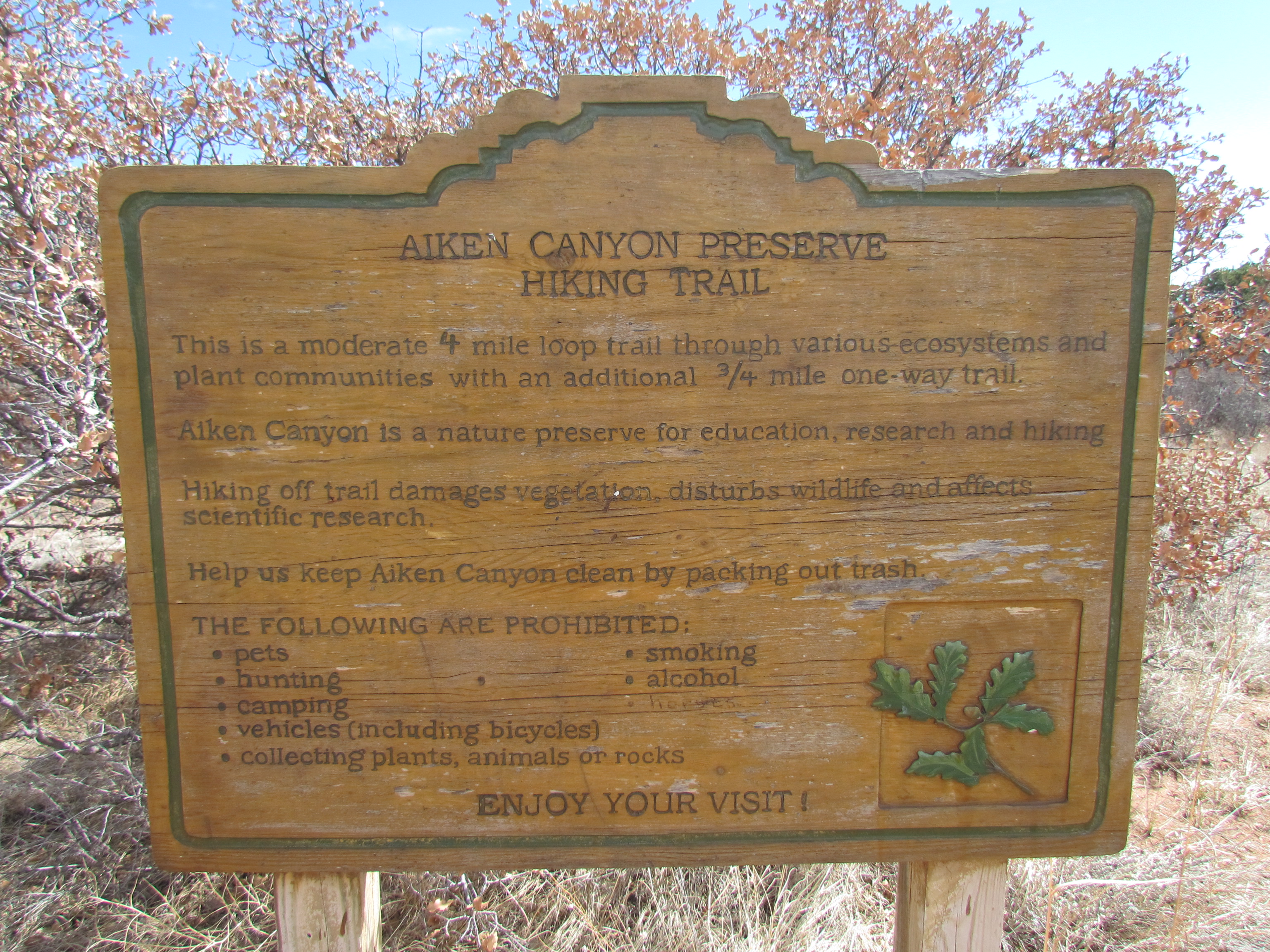 IMG_3880 (1) Published August 26, 2018 at 3072 × 2304 in Aiken Canyon Preserve ← Previous Next → Weathered welcome sign