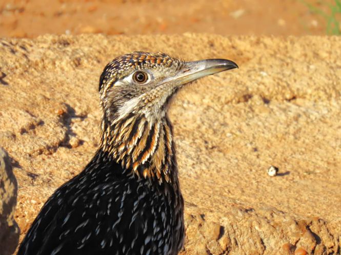 Measuring about 2 feet between the tip of the beak and the tip of the tail with a long neck, legs, and tail, roadrunners are conspicuous, even if their mottled brown, black, and white feathers blend well into the desert landscape. They belong to the Cuckoo family, Cuculidae, but unlike most cuckoos who live in trees, roadrunners spend most of their lives on the ground, a fact reflected in their genus name, Geococcyx, meaning “ground cuckoo,” from the Greek, geo, for “earth,” and kokkyx for “cuckoo.” If coccyx reminds you of the anatomical name for the tailbone, I salute you. Apparently, this curved bony appendage that’s located inferior to the sacrum reminded some early anatomists of a cuckoo’s curved beak.
